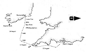 By 18.15 the wind had moderated enough for us to hoist one third of the storm jib in an effort to give a positive direction, hopefully towards Dunmore East at the entrance to Waterford harbour. Dunmore East seemed to be where we were heading. By this time the skipper was navigating on a very wet chart using a plastic knife and fork, all the other instruments having mysteriously disappeared!